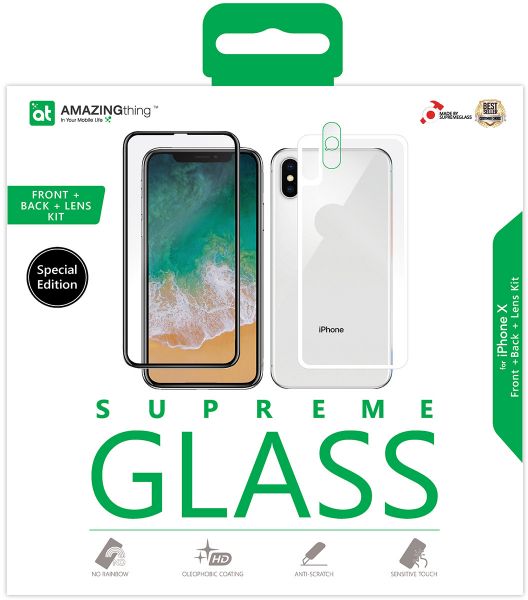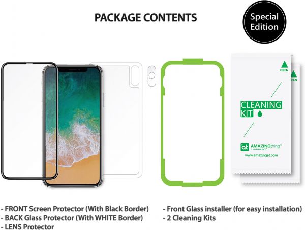 AmazingThing Supreme Glass SPECIAL EDITION FRONT and BACK Tempered Glass Screen and BACK Protectors with LENS Protector for the Apple iPhone X os all you need to protect your device. The Full Cover Screen protector features a high level of 9H Hardness rating to Protect your screen as well as the Back Glass which has a matching White border. The Bonus Lens Protector protects your camera Lens. Screen Protector installation has been made Easier with the included Front Glass Installer