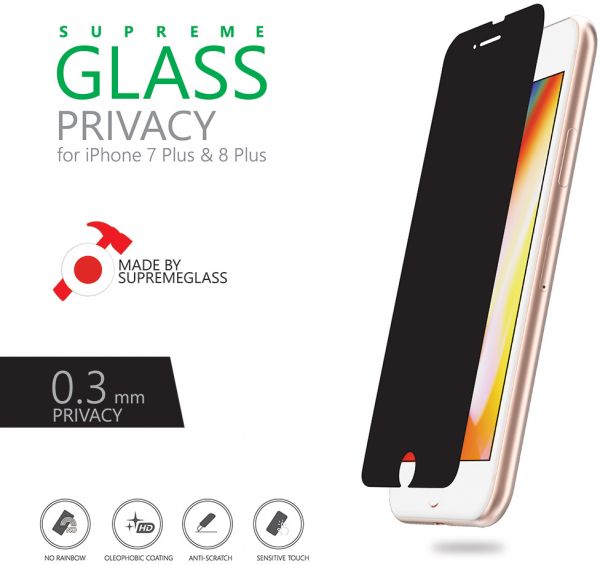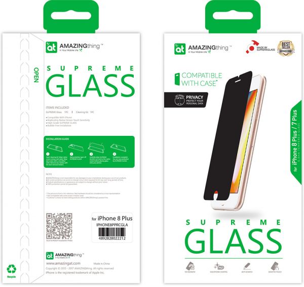 AmazingThing Supreme Glass PRIVACY Tempered Glass Screen Protector for the Apple iPhone 8 PLUS / iPhone 7 PLUS keeps your information confidential by shielding visibility from people around you. Privacy is extremely important for commuters, regular travellers to allow usage of phone freely to answer sensitive emails or enjoy downtime without worrying about prying eyes looking at your screen. While you can see the screen clearly, people around you see a Blank screen. The Supreme Glass Privacy is only 0.3mm thick but features a high level of 9H Hardness rating to Protect your screen. Supreme Glass Extra Hard also features curved rounded edges for a safe, comfortable and precise fit. The Oleophobic coating prevents fingerprints and contaminants making the glass protector easy to clean. The protector is 3D Touch compatible wherein Touch Screen sensitivity is maintained like the original screen. The Protector is purposely manufactured a bit smaller than the original screen size making it a Case Friendly Glass Protector allowing you to install most covers without any problem