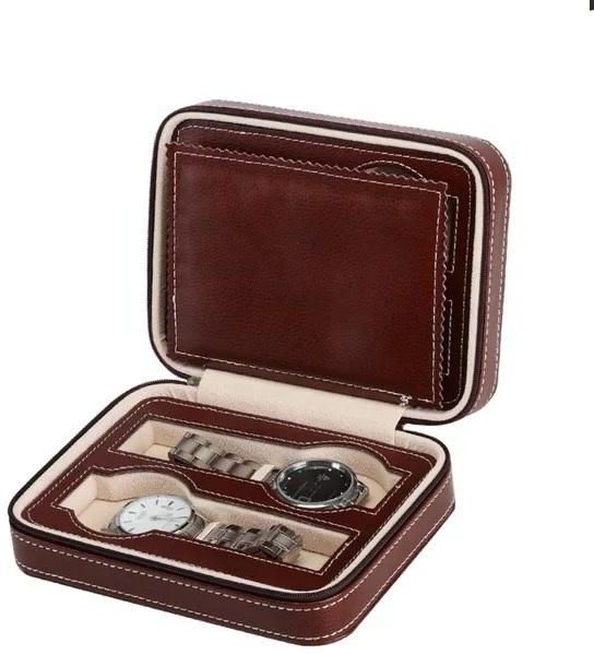 Luxury Leather Portable Watch Travel Case Brown Zipper Book 4 Slots Box