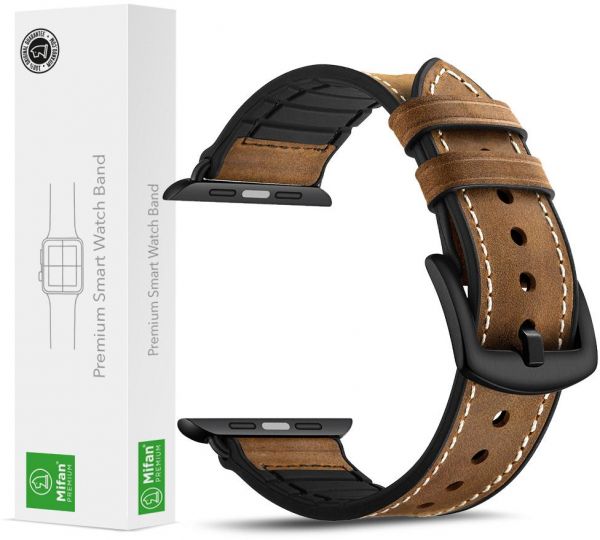 Mifan Hybrid Apple Watch Band 38mm iWatch Strap Replacement is made of genuine leather and soft food grade silicone . It is quite an excellent replacement band and a unique supplementary band to the official ones . The silicone material to the skin side will enhance the durability and repel the humidity and sweat and adding sports style , while the genuine leather material on the top remains the premium elegant look .
