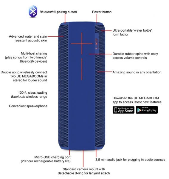 UE Megaboom wireless Bluetooth speaker electrifies your senses with its blasting sound. This UE portable speaker creates a fantastic 360 degree audio effect. Take out your best party suit and hop on a musical adventure with the powerful UE Megaboom Wireless Bluetooth Speaker. This stylish and robust musical genius will drive you crazy with its freakishly immersive sound and a booming bass. It does not spoil your fun with low battery alert as it packs a high capacity battery that keeps the fun alive for up to 20 hours on a single full charge. With sturdy, water resistant build, this Bluetooth speaker can be taken anywhere; in mud, under water, on the top of a mountain or wherever your energetic self and party mood takes you.