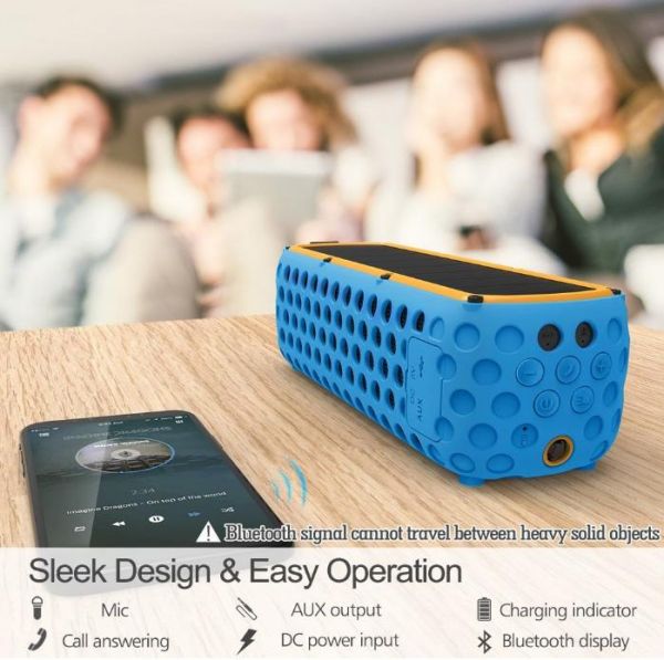 Shockproof and Splashproof: Silicone rubber cover and advanced solar panel mean you don't have to afraid of dropping it 6.5 feet in height and breaking it. IPX5 rating speaker can resist gentle water spray & splash but cannot be partially or fully submerged.